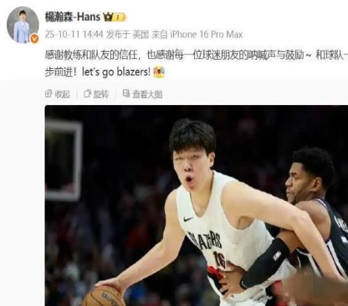 他在自己的社交平臺發(fā)文:Yang Hansen is taking over(楊瀚森正在統(tǒng)治比賽)。