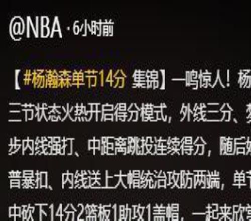 而NBA的官方賬號也對楊瀚森送上祝賀,稱贊他的表現(xiàn)是“一鳴驚人”“夢幻腳步!