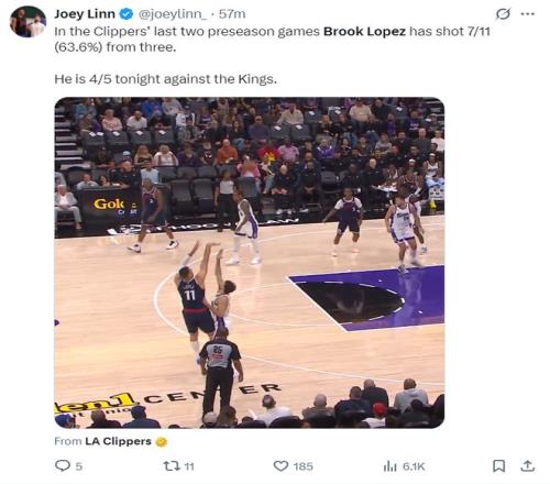 快船記者Joey Linn寫道:大洛最近這兩場(chǎng)季前賽,三分球11中7,三分命中率高達(dá)63.6%。