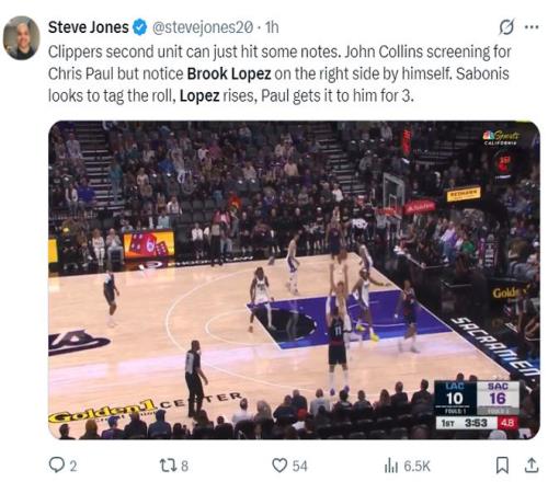 快船記者史蒂夫-瓊斯寫道:快船的第二陣容表現(xiàn)很不錯(cuò),科林斯為保羅掩護(hù),大洛去右側(cè)蹲著拉開空間,等小薩去協(xié)防保羅后,保羅甩出來給大洛三分命中。
