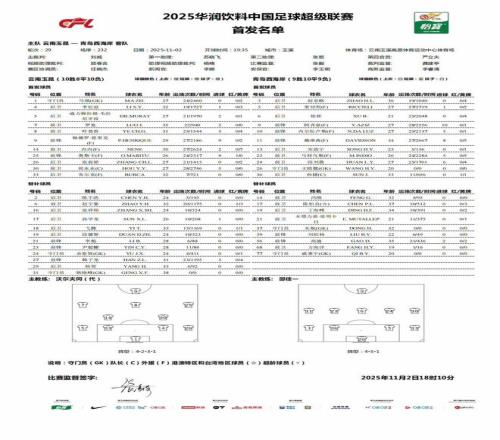 北京時間11月2日19:35,中超第29輪,云南玉昆主場對陣青島西海岸。賽前首發(fā)公布。